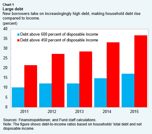 Although the pace of increases has slowed somewhat recently, home prices in Sweden have risen to high levels, especially in the main cities. Swedes looking for housing are taking out increasingly large mortgages. It is seen in the rising shares of new mortgage borrowers whose debts are staggeringly high relative to income (see Chart 1).