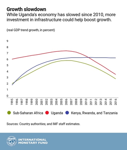 Drought, slow credit growth, and indirect effects of regional conflict are taking their toll on Uganda, but infrastructure and oil sector investment could boost growth over the next 3–5 years, said the IMF in its annual assessment of the Ugandan economy.
