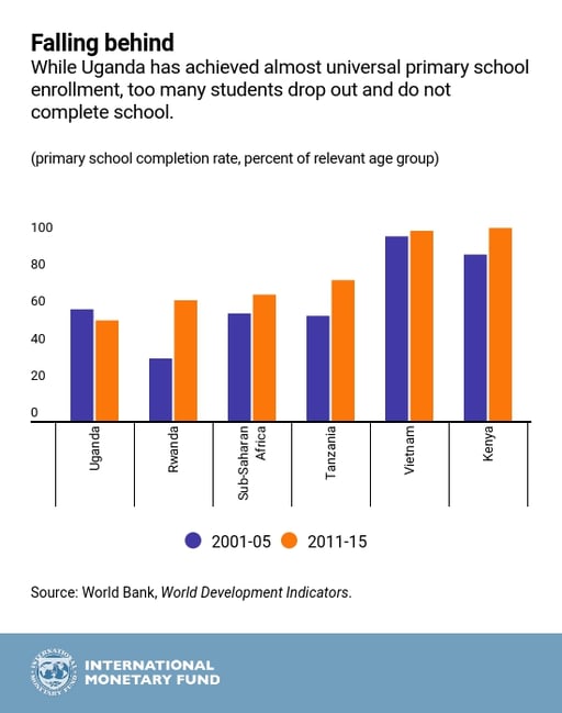 The report notes that, in parallel, attention to social spending on health and education is needed to ensure that all Ugandans can seize the opportunities offered by improved infrastructure and regional integration in the East African Community. For example, primary school completion rates have recently declined and are lower than those of peers.