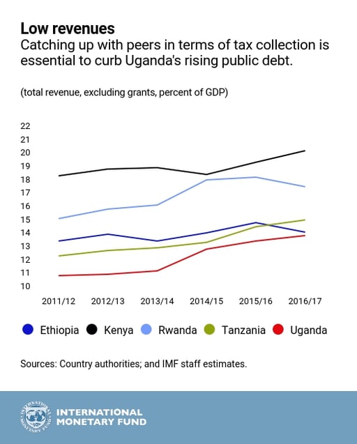 Moreover, Uganda’s revenue collection is low, for example, relative to its peers in the East African Community. The study emphasizes that the government should continue with its strategy to increase tax revenues by ½ percent of GDP per year. Over the medium term, higher growth, with increased tax collection, and with the infrastructure program completed, will make the overall fiscal deficit converge to its 3 percent of GDP target to ensure that public debt declines again.