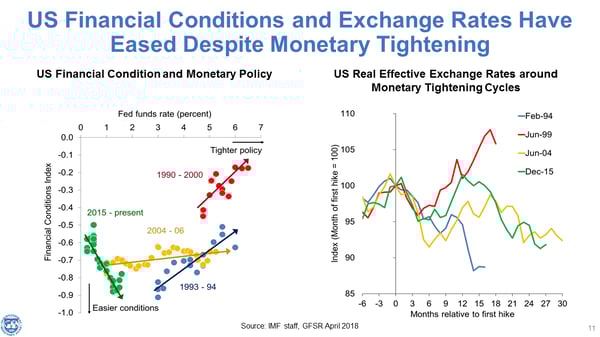 Contrary to previous periods of monetary tightening: In the current tightening cycle in the United States, financial conditions are not actually tightening. In fact, they have eased somewhat.