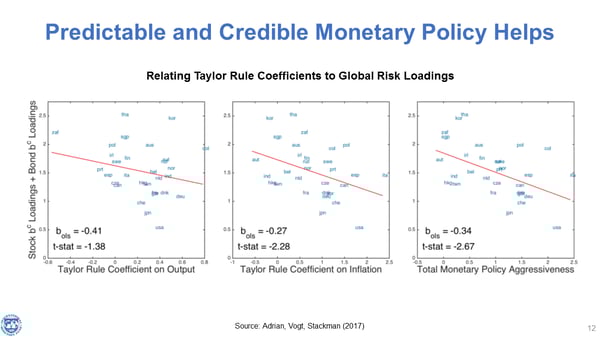 We have seen before that the exposure to the global price of risk affects the macroeconomic risk-return tradeoff across countries (Adrian, Stackman, and Vogt, 2016). Now we want to understand to what extent does monetary policy affect the relationship between the global price of risk and the risk-growth tradeoff. Specifically, does a more aggressive monetary policy—and for that matter, fiscal and macroprudential policies as well—reduce the effect of global financial conditions on macroeconomic volatility while preserving the beneficial effects of economic and financial openness on growth?