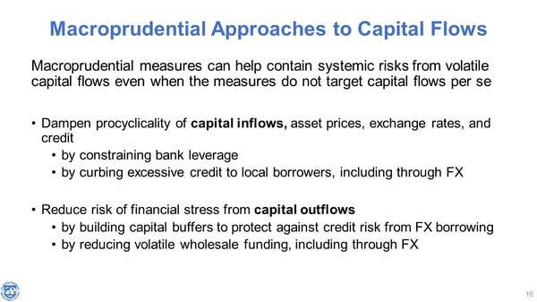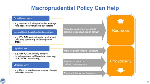 Macroprudential policy increases an economy’s resilience to capital flows, especially during episodes of outflows, by building capital buffers or by reducing the reliance on wholesale funding.