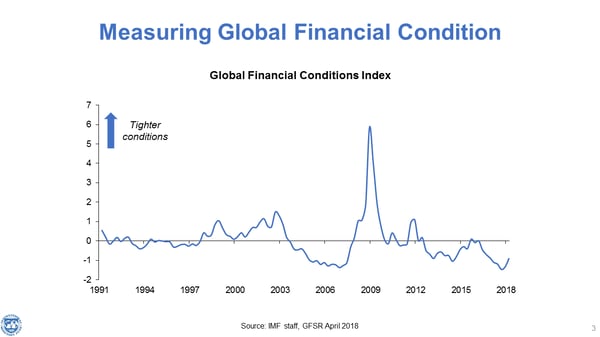 In this chart from our most recent GFSR (IMF 2018b): We show one such index—the “Global Financial Conditions Index,” or “FCI”—that is based on many variables. Considering that a higher value of FCI means tighter financial conditions, the chart depicts the sharp year-by-year change in global financial conditions.