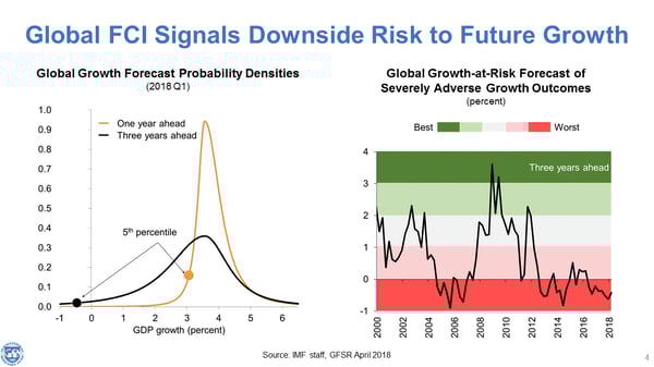 These charts depict our most recent measurements using our “Growth-at-Risk” methodology, which we described in detail in our previous GFSR, last October—and which we used in this spring’s report (IMF 2018b). You can see here how, currently, the Global FCI measures the downside risks to GDP.