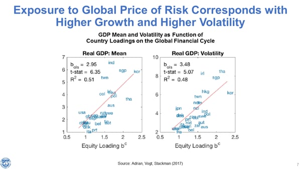 When we look across countries, we see a striking pattern. As you can see in these charts from Adrian, Vogt, and Stackman (2016): Those countries where equity prices correlate more strongly with a global risk factor, they tend to have higher GDP growth and higher GDP volatility. This suggests a risk-return tradeoff: more exposure to global financial conditions means higher growth, but also higher risk.