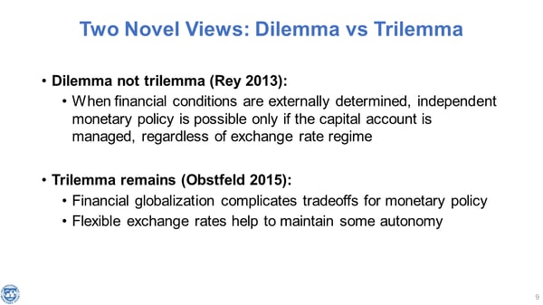 My IMF colleague Maury Obstfeld, on the other hand, maintains that the Trilemma still applies, but that it requires a more nuanced approach (Obstfeld, 2015). There is an admission, in that view, that financial globalization complicates monetary policy—but exchange-rate flexibility continues to be crucial as a shock absorber. The issue is not really one of monetary-policy independence, but one of its effectiveness.