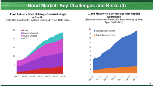 On the liability side: These vehicles are largely funded by the issuance of investment products. About half of them are sold to investors as high-yielding alternatives to bank deposits.