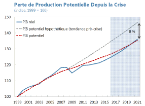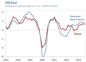 1. L’économie française se redresse, mais pas à un rythme qui permettra la réduction nécessaire du niveau élevé du chômage et de la dette publique. Au cours des dernières décennies, la croissance a été portée par la hausse des dépenses publiques, la dynamique robuste des salaires et de la productivité ainsi que par une croissance soutenue de la population active. Mais la crise a eu de lourdes conséquences : le chômage reste obstinément à un niveau élevé et le ratio de la dette publique continue d’augmenter, approchant 100 %. Comme les moteurs traditionnels de la demande globale s’essoufflent et que la reprise économique dans la zone euro demeure fragile, les perspectives à moyen terme sont modérées. La croissance du PIB réel devrait être proche de 1½ % en 2016, et nous prévoyons qu’elle atteindra en moyenne 1¾ % dans les cinq prochaines années. Selon ce scénario, la production resterait quand même bien inférieure au niveau qui aurait été atteint si la tendance d’avant la crise s’était maintenue. Par ailleurs, ce scénario repose sur l’hypothèse que l’économie ne subira aucun choc économique majeur, ce qui ne saurait être tenu pour acquis. De nouvelles tensions sur les marchés financiers mondiaux ou dans les pays émergents, ou une stagnation prolongée dans la zone euro, constitueraient d’importants défis.