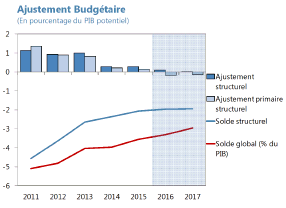 5. Le déficit budgétaire est en baisse, mais l’ajustement structurel s’est affaibli. Du fait de la reprise de la croissance et de la baisse des taux d’intérêt, le déficit budgétaire 2015 est tombé à 3,6 % du PIB, soit un niveau inférieur à celui qui était inscrit au budget, grâce à la maîtrise des dépenses, en particulier au niveau local, et aux mesures prises pour compenser l’impact des dépenses imprévues, notamment celles liées à la sécurité. Cependant, abstraction faite des effets de la reprise conjoncturelle et de la baisse de la charge de la dette, l’ajustement budgétaire structurel a ralenti et est presque nul. En conséquence, nous prévoyons que, sans mesures supplémentaires, la France atteindra à peine l’objectif de déficit de 3 % du PIB en 2017, et l’objectif d’équilibre structurel semble hors de portée dans les cinq ans à venir. La dette devrait culminer à 98 % du PIB en 2017 et ne diminuer que lentement par la suite.