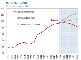 6. Le programme d’ajustement budgétaire du gouvernement pourrait facilement échouer en cas de chocs ou de difficulté à mettre en œuvre les mesures nécessaires. Pour atteindre l’objectif d’une croissance nulle des dépenses réelles à moyen terme, des mesures supplémentaires doivent encore être précisées, en particulier dans la loi de finances 2017, et il est de plus en plus difficile de compenser d’éventuels nouveaux besoins de dépenses. La consolidation budgétaire pourrait aussi être mise à mal par de nouveaux chocs qui, selon les simulations des services du FMI, pourraient porter la dette bien au-delà de 100 % du PIB. Comme il n’y a quasiment plus de marge de manœuvre budgétaire, il est important que la France ne rate pas l’opportunité qu’offre la reprise économique en cours d’accroître les efforts pour reconstituer ses amortisseurs budgétaires et assainir les finances publiques.