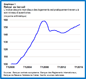 En 2007-08, les prix réels de l’immobilier résidentiel se sont effondrés dans plusieurs pays, marquant le début de la crise financière mondiale. L’indice des prix mondiaux des logements du FMI, moyenne arithmétique des prix réels de l’immobilier résidentiel dans 57 pays, est pratiquement revenu à son niveau d’avant crise (graphique 1). Faut-il de nouveau s’inquiéter et craindre une chute des prix de l’immobilier résidentiel au niveau mondial?