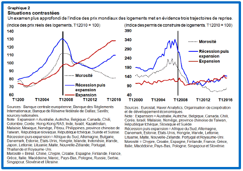 À regarder plus près l’indice des prix mondiaux du logement, trois groupes de pays se distinguent (graphique 2, partie gauche).