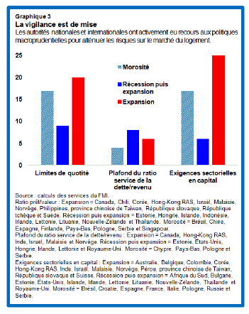 Autre différence par rapport à la période précédant la crise : les autorités de réglementation nationales et internationales se montrent davantage vigilantes à l’égard de l’envolée des prix de l’immobilier résidentiel et recourent à des politiques macroprudentielles pour les juguler. Ces politiques ont été assez largement adoptées dans la période qui a suivi la crise, en particulier dans les groupes «morosité» et «expansion» (graphique 3).