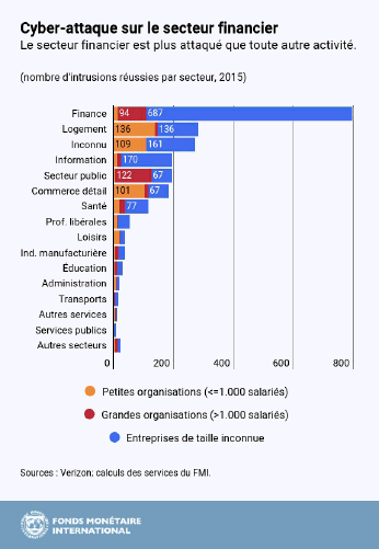 Certaines des cyber-attaques les plus dangereuses concernent les virements de fonds et les distributeurs de billets de banque, l'introduction de logiciels malveillants (« maliciels ») dans les systèmes informatiques des banques, la destruction de dossiers et de matériel ainsi que des tentatives d'extorsion de fonds qui perturbent les opérations internes.