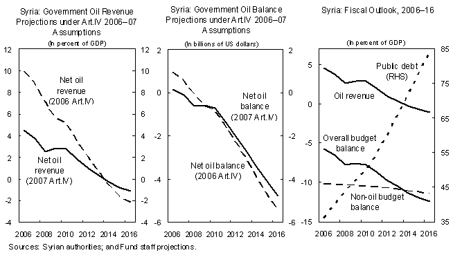 13. The growth outlook for 2007 remains favorable. The critical mass of reforms implemented in recent months, the continued direct and indirect support of aggregate demand from the Iraqi presence, and favorable growth prospects globally and in the region are expected to continue to underpin private consumption and non-oil exports, as well as a possible strengthening of private investment. These factors could sustain the growth momentum at about the same pace as in 2006.3 Any slowdown of capital inflows associated with the Iraqis will dampen aggregate demand directly and through second round effects, including an unwinding of the wealth effect induced by the real-estate boom. However, a normalization of the political situation in Iraq could open a large market for Syrian products. 14. To keep inflationary pressures in check, macroeconomic policies should remain appropriately tight. The current level of benchmark interest rates is appropriate and state banks' lending should remain in line with the monetary objectives. Fiscal policy should aim to reduce the overall budget deficit to about 5 percent of GDP mainly by phasing out petroleum price subsidies and further rationalizing of expenditures. Civil service wage policy, which leads wage policy in the rest of the economy, has a major role to play in curbing inflation, by ensuring that wage increases do not run ahead of productivity gains. 15. Syria needs to continue to grow faster but it also needs to grow better in the coming years. The growth acceleration in the past two years seems to have been largely driven by private consumption, with an initial impulse originating from the influx of Iraqis. For this growth to strengthen and solidify, it is important that the sources of growth be rebalanced toward investment and durable gains in external market shares. Stronger investment growth and higher productivity are the bedrocks of high and sustainable growth in the long run. 16. To rebalance growth, Syria should continue to strengthen its macroeconomic policy frameworks and to accelerate structural reforms. Policies geared toward accelerating reforms and preserving financial stability could validate investors' expectations and strengthen savers' confidence about returns on Syrian assets. A positive synergy—such as the one witnessed in the rapid take-off of private banking—between an increased willingness on the part of savers to invest their funds in Syria rather than abroad or in idle foreign currency, and an increased willingness of investors to take the risk of starting new projects could turn the promise from the large increase in investment approvals into a reality. 17. The remainder of this statement focuses on: (i) policies to protect fiscal solvency, (ii) a more explicit monetary policy framework in the context of the unified exchange rate regime to anchor price stability, and (iii) key structural reforms. Fiscal sustainability 18. The timely adjustment to the secular trend decline in oil revenues in the past three years is highly welcome. Looking forward, there is a need to sustain this effort as oil revenues continue to dwindle. Addressing all the pockets of inefficiency in public spending associated with technical losses and across-the-board subsidies to consumers, producers, and public employment will achieve durable fiscal savings while enhancing the supply side of the economy. A large share of the freed up resources could be channeled to finance targeted support to the most vulnerable segments of society and to productive expenditures on basic infrastructure, higher education, and research and development. This will complement private investment by enhancing its potential returns. 19. In this regard, a comprehensive public expenditure review is essential. It should focus on: (i) settling the inter-enterprises arrears among PEs and stopping any such accumulation in the future as this practice dampens incentives for sound and transparent financial management and leads to a lack of accountability; (ii) reviewing the efficiency and effectiveness of expenditures in major sectors such as education, health, and public transportation with a view to reprioritization and deep reforms; and (iii) reviewing the social protection system—the current system is mostly based on rationing (coupons) and on inequitable and inefficient price subsidies. It needs to be reformed toward means-tested targeted transfers. 20. Phasing out the inequitable petroleum price subsidies (PPS), whose cost exceeds 15 percent of GDP, is a key pillar of fiscal reform. Beyond large fiscal savings, it would provide significant efficiency gains, improve equity, entail a smaller negative fiscal impulse, and contribute to BOP adjustment. We are encouraged to know that some preparatory work is being done to launch this reform, and urge the authorities not to delay it further. Each day the public coffers loose SP 750 million (i.e. close to US$15 million, three times the annual budget devoted to promoting tourism) on a policy that has lost all purpose, while so many legitimate claims on public money remain unfulfilled. 21. Stepping up preparations to introduce a VAT is needed to ensure that the VAT is phased in on time to help offset the future drain on oil revenues. The mission agrees that an ill-prepared launch could damage the credibility of this new tax, and indeed many steps, including the adoption of a tax procedures code and an integrated IT system, have yet to be completed. However, preparation could move much faster, if the authorities were to choose a simple design, an option that would very much be in line with the new vision driving tax policy reform toward simpler taxes and lower rates. A uniform rate with very few exemptions lowers the compliance costs on taxpayers and the burden on the tax administration and closes loopholes, which create opportunities for corruption. Concerns about social equity are best addressed by excises on luxury goods, well targeted 