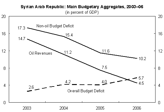 This has reflected both a sharp contraction of oil production from about 480 thousand barrels per day to about 400 thousand and a galloping growth in domestic demand (an annual average rate of 10½ percent) owing to a decline in the prices of refined products in real terms, increased smuggling to neighboring countries, and the impact of the Iraqi refugees. A cumulative improvement in the non-oil budget deficit of 7 percentage points of GDP narrowed the non-oil budget deficit to about 10 percent of GDP, strengthening significantly the medium-term prospects of fiscal sustainability. 12. The quality of the fiscal adjustment was commendable. During the last three years, corporate income tax rates have been lowered drastically—with the top marginal rate coming down from 65 percent in 2003 to 28 percent in the latest amendment—and tariffs rates have been reduced significantly. Tax administration improvements together with higher growth fully compensated for the cut in rates and helped maintain a stable tax intake as a percent of GDP and increase its total volume. The bulk of the fiscal adjustment has been contributed by caps on investment spending and an increase in dividend payments from profitable public companies, mainly in telecommunication, which boosted nonoil revenues by close to 3 percentage points of GDP during 2004-06. The compression in capital spending is largely believed to have represented cuts in wasteful spending, and at 9 percent of GDP, its level in 2006 is still fairly high. The creeping rise in current expenditures reflected mainly the increase in subsidies to loss making PEs and pension and social assistance payments.