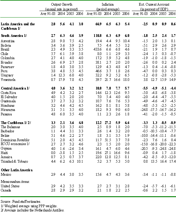 The world economy is expected to remain supportive for the Latin American and Caribbean (LAC) region. While global activity has moderated in 2005, the short-term outlook looks solid and global GDP growth is projected to remain above trend at 4¼ percent in 2005 and 2006. This reflects, in part, the resilience of the U.S. economy in the face of recent hurricanes and high oil prices. Although risks are now tilted to the downside, still accommodative monetary and fiscal stances, the ongoing improvement of corporate balance sheets, and favorable financial market conditions are expected to underpin global growth. The Latin American region-which continues to benefit from strong commodity prices-is projected to grow above trend at 4 percent and 3¾ percent in 2005 and 2006, respectively.