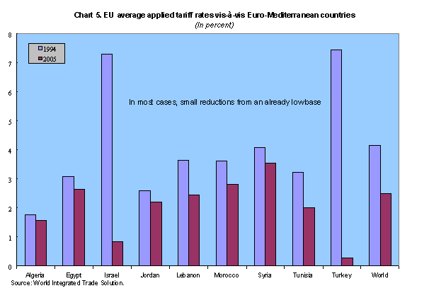 • Some progress on trade liberalization was made. All but one of the Euro-Mediterranean countries have signed association agreements with the EU providing for the gradual elimination of industrial tariffs and the removal of non-tariff barriers.5,6 Moreover, a few trade agreements between Mediterranean countries have also been reached, notably the 2004 Agadir Agreement between Morocco, Tunisia, Jordan, and Egypt.7 In addition, work on harmonizing customs procedures and improving rules for determination of origin has borne some fruit.
