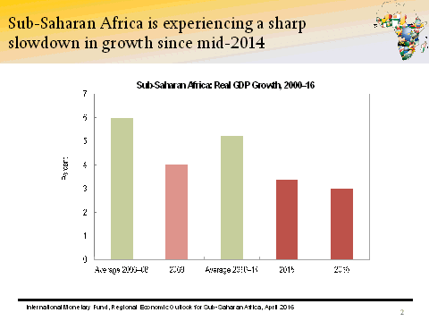 Growth weakened markedly in Sub-Saharan Africa in 2015, to 3½ percent—the lowest level in 15 years. The slowdown should continue into 2016, with growth projected at 3 percent—roughly half the rate Africa has grown accustomed to.