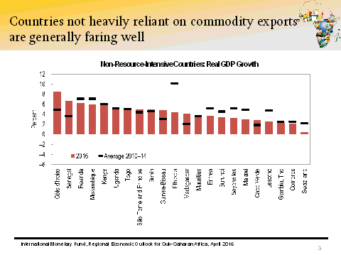 This is all closely related to developments in China. Excluding commodities, this region has always had a trade deficit with China. But during the commodity boom Sub-Saharan Africa ran a trade surplus with China. This large trade surplus has turned into a deficit in less than a year. There is no reason to think that China is going to return to rapid levels of growth that drove global growth after the 2008 financial crisis. That train has left the station. But China will remain a force in the global economy. There is a risk that China’s rebalancing will proceed faster than projected in the IMF’s April 2016 World Economic Outlook. If that happens, Sub-Saharan Africa may grow even less.