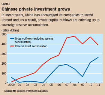 In fact, China has been encouraging not only its corporations but also institutional investors—such as mutual funds and pension companies—to invest abroad. In 2006, it even set up the Qualified Domestic Institutional Investor scheme, a parallel to its QFII program, to sanction investments abroad up to specified limits. As a result of such measures, other forms of outflows have been rapidly catching up to official outflows for currency reserves (see Chart 3). Preliminary data for 2012 show that reserve accumulation fell sharply even as other outflows continued to increase, a trend that is likely to continue.