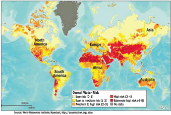 Today’s water challenges take many forms. In some parts of the world, the problem continues to be inadequate access to safe water and sanitation—the prime focus for the water effort of the United Nations Millennium Development Goals (MDGs). In other regions, there is growing competition for limited water resources among agricultural, industrial, domestic, and ecological users. The misalignment of political borders and watershed boundaries has long complicated the effective management of water systems, and, in many parts of the world, these political challenges are getting worse, not better, leading to a growing risk of conflict. Finally, climate changes are increasingly affecting water availability, quality, and demand in ways that most water managers are not prepared for, and new efforts are needed to identify future climate-related risks and opportunities (see map).