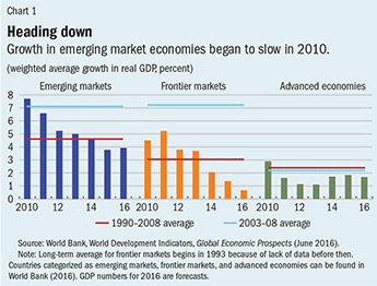 External and domestic as well as cyclical and structural factors have contributed to the slowdown in emerging markets. The growth slowdown, which began in 2011, was initially driven by external factors, such as weak world trade, low commodity prices, and tightening financial conditions. But since 2014 domestic factors—including a steady slowdown in productivity growth, bouts of policy uncertainty, and tighter government budgets that have made it difficult to stimulate economic activity—have become increasingly important. Decelerating potential growth—that is, the speed at which an economy could grow—accounts, on average, for one-third of the slowdown in emerging market growth since 2010. Much of the decline resulted from a slowdown in productivity growth, which, in part, reflects an aging population.