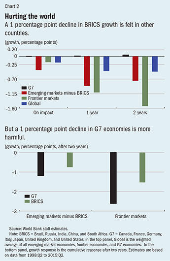 On average, a 1 percentage point decline in growth in the BRICS could, over the subsequent two years, reduce global growth by 0.4 percentage point, growth in non-BRICS emerging markets by 0.8 percentage point, and growth in frontier markets by 1.5 percentage points (see Chart 2, top panel). Specifically, between 2010 and 2015, the slowdown in the BRICS accounted for a sizable share of the growth slowdown in other emerging and frontier markets.
