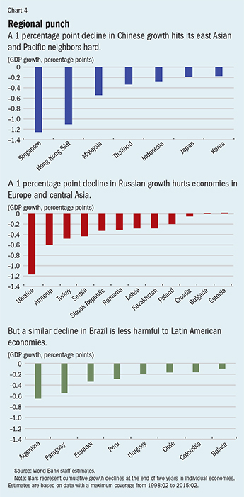 In other words, the potency of spillovers varies across regions. In some, strong regional trade and financial links are reflected in sizable spillovers—for example, in Europe and central Asia from lower growth in Russia and in east Asia and the Pacific from a slowdown in China. Spillovers from Brazil, India, and South Africa to other economies within their respective regions are generally insignificant. For many countries, spillovers originating in distant major advanced economies overshadow within-region spillovers from their large emerging market neighbors.