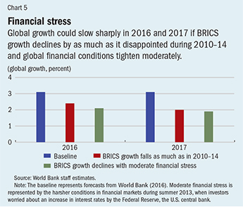 A synchronous slowdown in the economies of the BRICS could have much more pronounced spillover effects if it is accompanied by such financial market stress. If BRICS growth slows further, by as much as it disappointed on average during 2010–14, and if financial conditions tighten moderately—as during summer 2013, when financial markets were upset by potential Federal Reserve tightening of monetary policy—global growth could shrink by about a third in 2016 (see Chart 5).
