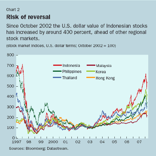 Second, a rise in asset values, notwithstanding the recent falls, carries risk of a more serious reversal. Since October 2002 the U.S. dollar value of Indonesian stocks has increased by around 400 percent, ahead of other regional stock markets (see Chart 2). Much of this is a delayed catchup following the crisis, and economic fundamentals remain sound.