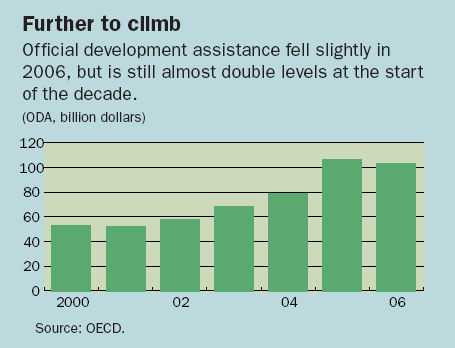 Based on the G8 commitment in Gleneagles in 2005 to double aid to Africa, the OECD estimates that assistance from the DAC countries would rise by $50 billion in real terms between 2004 and 2010