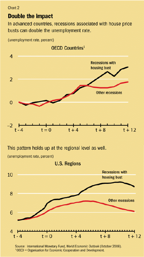 There is some evidence that this pattern holds up at both the national and regional levels. As shown in Chart 2 (lower panel), during regional recessions in the United States that are associated with a housing bust, the peak impact on unemployment is an increase of 4 percentage points, compared with an increase of 2 percentage points for all regional recessions.