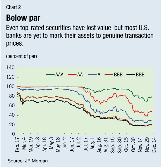 However, most banks in the United States have not yet marked their assets to genuine transaction prices, or to proxy ABX indices (see Chart 2). Distressed or vulture funds are expecting large price declines this January and February, after the bonus season (see IMF Working paper 03/161 for a summary on returns from distressed debt). Although many market participants assume that resets will be over by 2008, there is an 18-month lag from end-2008 (or mid-2010) when such resets lead to delinquencies that result in cash flow problems.