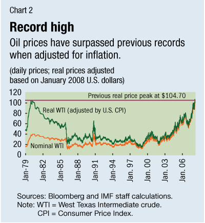 In particular, oil prices surged from around $90 a barrel in late January 2008 to over $105 a barrel by mid-March, surpassing their previous record high in constant prices set on December 17, 1979 (see Chart 2). Base metal prices rebounded after falling during the second half of 2007.