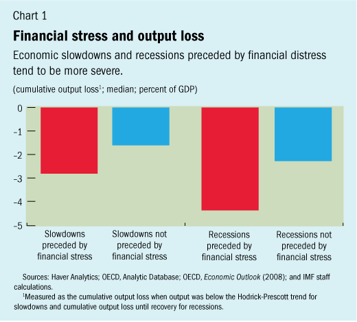 Published in an analytic chapter of the October 2008 World Economic Outlook, entitled "Financial Stress and Economic Downturns," the research shows that when financial stress hits core financial intermediaries, the downturns that follow are typically more severe than slowdowns or recessions not preceded by financial stress (see Chart 1). In particular, slowdowns or recessions preceded by banking-related stress tend to involve 2-3 times greater cumulative output losses and tend to endure 2-4 times as long.