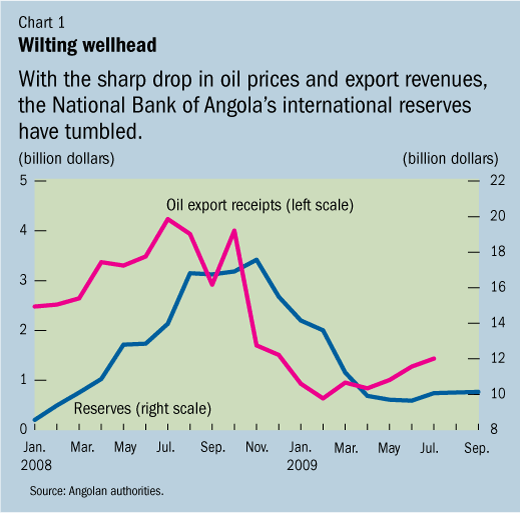 The global economic crisis has severely affected Angola’s economy. With the sharp drop in oil prices and export revenues (see Chart 1) the economy has slowed sharply, while fiscal and external positions have turned from large surpluses to deficits. As a result, usable reserves fell by one-third to only 2¾ months of imports through June 2009, partly reflecting the National Bank of Angola’s (BNA) efforts to stabilize the exchange rate and the government’s drawdown of its foreign currency deposits at the BNA as deficit financing became difficult.
