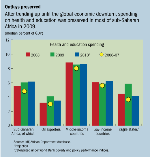 The IMF’s Regional Economic Outlook for sub-Saharan Africa said early figures showed that last year median spending on health and education was above 2006–07 levels for all country groups—and especially for fragile states, which sharply increased their outlays.