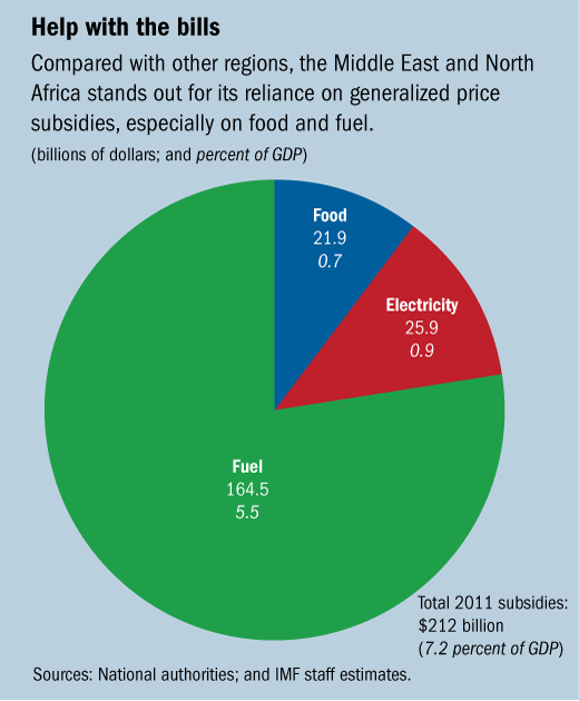 Compared with other regions, MENA stands out because of its heavy reliance on generalized price subsidies, especially on food and fuel. The IMF’s Middle East and Central Asia department estimates the cost of subsidies at about $212 billion in 2011, or over 7 percent of regional GDP, of which about 80 percent reflect fuel subsidies (see chart).