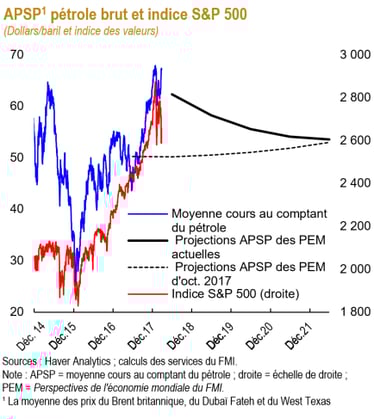 Les perspectives des cours du pétrole restent marquées par une grande incertitude, qui tient essentiellement aux doutes entourant l’offre. En forte progression au second semestre 2017, les cours du pétrole ont dépassé 65 dollars le baril en janvier, sous l’effet de l’amélioration des perspectives de la croissance mondiale, de la prolongation de l’accord OPEP+ (visant à limiter la production de pétrole jusqu’à la fin 2018), d’interruptions imprévues de la production et de tensions géopolitiques. Plus récemment, l’essor de la production du pétrole de schiste aux États-Unis a exercé un effet baissier sur les cours du pétrole. Au vu de ce contexte, les perspectives à moyen terme des cours du pétrole restent timides, malgré la révision à la hausse des projections pour 2018 et 2019 par rapport aux Perspectives économiques régionales du Moyen-Orient et de l’Asie centrale d’octobre 2017 (voir graphique).