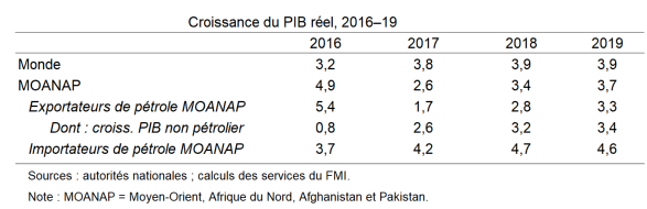 Après avoir touché son point le plus bas en 2017, la croissance économique des pays exportateurs de pétrole de la région Moyen-Orient, Afrique du Nord, Afghanistan et Pakistan (MOANAP) devrait s’accélérer en 2018–19. Cette tendance tient en grande partie à la reprise durable des activités non pétrolières, au moment où de nombreux pays temporisent leurs rééquilibrages budgétaires afin de soutenir la demande intérieure. Les aléas entourant les perspectives sont de nature baissière. Il s’agit de la possibilité d’un resserrement drastique des conditions financières dans le monde, de la montée des tensions commerciales et des pressions géopolitiques, alors même que les perspectives des cours du pétrole restent modérées et hautement incertaines. S’ils viennent à se matérialiser, ces risques pourraient exercer des pressions considérables sur les budgets et le financement dans de nombreux pays de la région, lesquelles pourraient mettre en péril le processus d’assainissement budgétaire et de reprise économique. Au vu de la faiblesse des perspectives de croissance sur le moyen terme, la nécessité d’accélérer le rythme des réformes structurelles prévues est plus évidente que jamais.