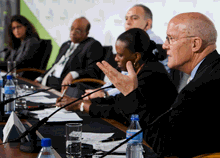 Bill & Melinda Gates Foundation Managing Director Geoffrey Lamb (r) addresses conference, with (from r) World Trade Organization Deputy Director General Valentine Rugwabiza, Moroccan Finance Minister Salaheddine Mezouar, Mo Ibrahim Foundation founder Mo Ibrahim, U.K. Department for International Development Permanent Secretary Nemat Shafik (photo: Stephen Jaffe/IMF)