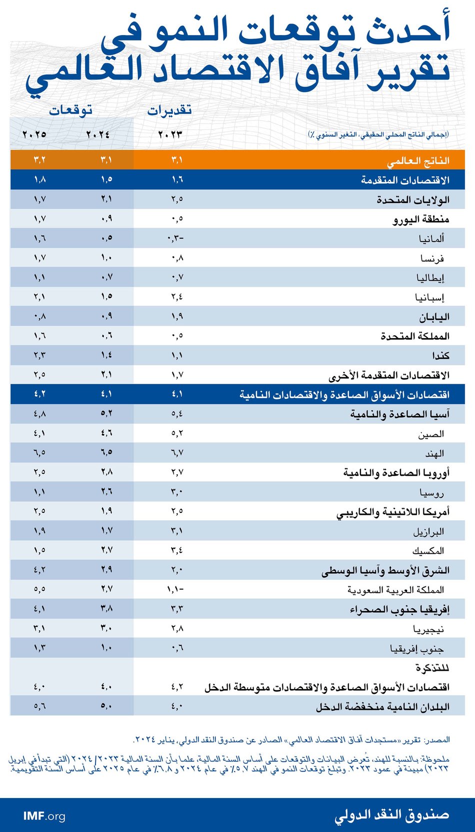 ولا تزال هناك اختلافات كبيرة. ونتوقع تباطؤ النمو في الولايات المتحدة، حيت لا يزال تشديد السياسة النقدية منعكسا على اقتصادها، وفي الصين، حيث لا يزال التأثير السلبي على النشاط من ضعف الاستهلاك والاستثمار مستمرا. وفي منطقة اليورو، في نفس الوقت، يُتوقع انتعاش النشاط بصورة طفيفة بعد عام 2023 الذي كان محفوفا بالتحديات، حينما أدى ارتفاع أسعار الطاقة وتشديد السياسة النقدية إلى تقييد الطلب. ولا يزال كثير من الاقتصادات الأخرى متمتعا بقدر هائل من الصلابة، مع تسارع النمو في البرازيل والهند والاقتصادات الكبرى في جنوب شرق آسيا.