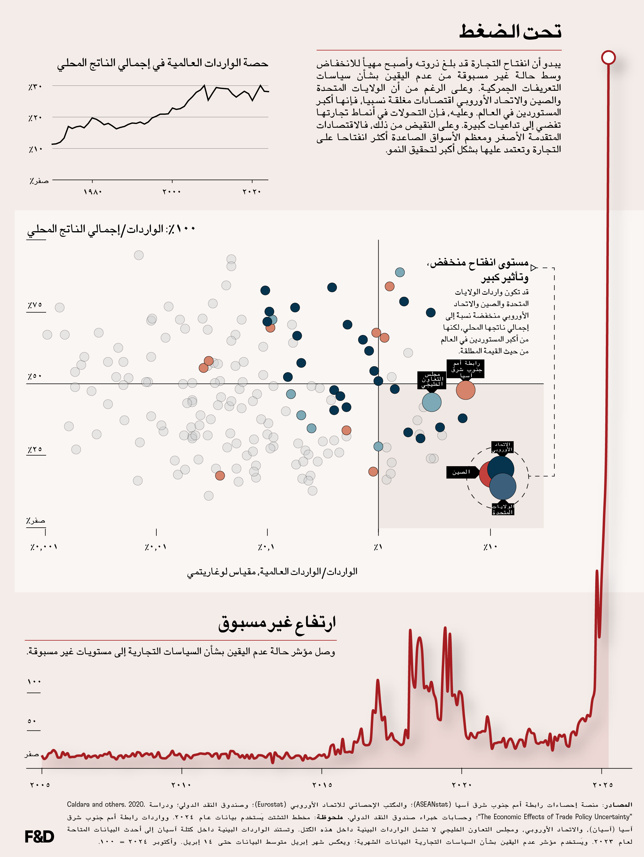 ولهذا المشهد التجاري الجديد عواقب وخيمة على الاقتصاد العالمي. فالعديد من البلدان الأصغر المعتمدة على التجارة أصبحت أكثر عرضة لهذه التحولات في أنماط التجارة. ووصل عدم اليقين بشأن السياسات التجارية إلى مستويات غير مسبوقة، مما جعل التخطيط للمستقبل أكثر صعوبة على مؤسسات الأعمال في كل مكان.