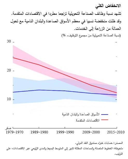 هناك انحسار في وظائف الصناعة التحويلية. ففي كثير من الأسواق الصاعدة والاقتصادات النامية، تتحول العمالة من الزراعة إلى الخدمات، متجاوزة هذا القطاع. وفي الاقتصادات المتقدمة، عادة ما يأتي ارتفاع التوظيف في قطاع الخدمات انعكاسا لاختفاء وظائف في قطاع التصنيع بشكل تام.