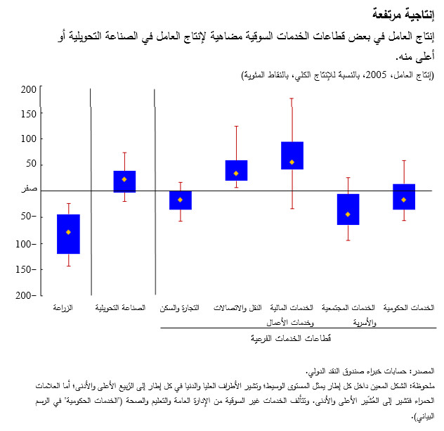 فبعض القطاعات الخدمية السوقية – كالنقل والاتصالات السلكية واللاسلكية والخدمات المالية وخدمات الأعمال – تفوق الصناعة التحويلية من حيث مستوياتها ومعدلات نمو إنتاجية العامل فيها. وبالإضافة إلى ذلك – وكما هو الحال في الصناعة التحويلية – غالبا ما تكون إنتاجية العامل في عدة قطاعات خدمية قريبة من الحدود العالمية: أي أنها تنمو بسرعة أكبر إذا كانت منخفضة نسبيا، مما يتيح للبلدان التي تتسم بمستويات إنتاجية أولية أدنى أن تلحق بالبلدان التي تحقق مستويات إنتاجية أعلى.