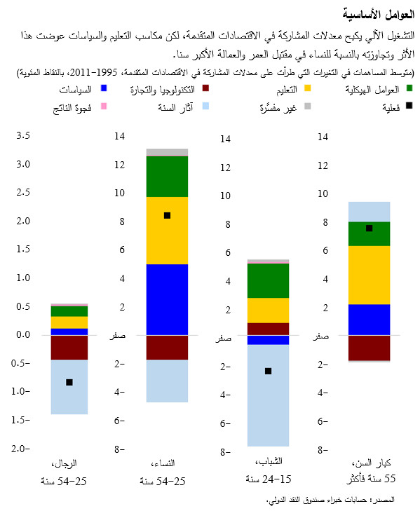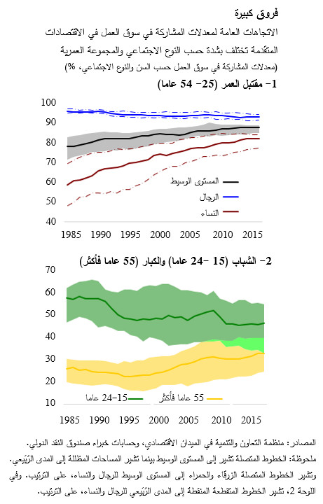 فعلى سبيل المثال، حدثت زيادة هائلة في مشاركة النساء منذ منتصف ثمانينات القرن الماضي. وفي تاريخ أقرب، حدث تحسن كبير في مشاركة العمالة الأكبر سنا، بينما تراجعت المشاركة بين الشباب. وفي كل الاقتصادات المتقدمة تقريبا، أصبح الرجال في مقتبل العمر، وخاصة الأقل في التحصيل التعليمي، منفصلين بصورة متزايدة عن سوق العمل. وتعتبر الولايات المتحدة مثالا بارزا بين الاقتصادات المتقدمة على انخفاض المشاركة في سوق العمل من جانب النساء والرجال في مقتبل العمر.