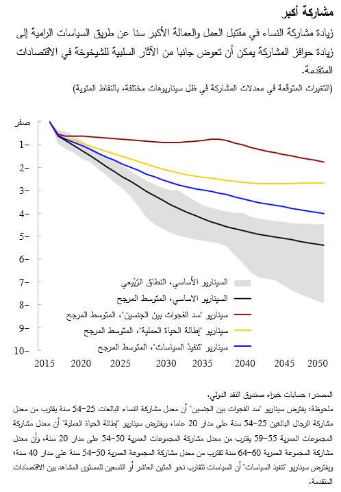 ولكن التحولات الشديدة في الهياكل الديمغرافية المتوقعة في الاقتصادات المتقدمة يمكن أن تطغى في نهاية المطاف على قدرة السياسات على تعويض الأثر الكامل لعوامل الشيخوخة. وتشير عمليات المحاكاة التوضيحية الواردة في الرسم البياني إلى أن المشاركة الكلية ستنخفض في نهاية المطاف – حتى إذا تم سد الفجوات بين الجنسين بشكل كامل – وأن مشاركة العمالة الأكبر سنا يتعين أن تحقق ارتفاعا كبيرا حتى يتلاشى الانخفاض في المشاركة الكلية بشكل كامل. ومن شأن الوصول بالسياسات إلى ما يمكن اعتباره "ممارسة مُثلى" (من منظور المشاركة في سوق العمل) أن يخفف بعض العبء المعوق الذي تفرضه الشيخوخة.