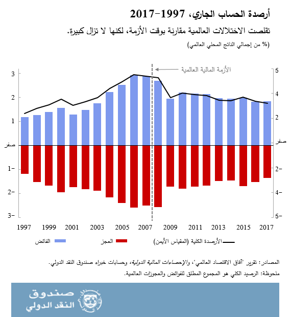 بعد انخفاض فوائض وعجوزات الحسابات الجارية العالمية في أعقاب الأزمة المالية العالمية، ظلت ثابتة نسبياً على مدار الخمس سنوات الماضية، وذلك عند مستوى 3.25% تقريبا من إجمالي الناتج المحلي العالمي. ويشير تحليلنا إلى أن حوالي 40% إلى 50% من هذه الأرصدة العالمية مفرطة وتزداد تركزا في الاقتصادات المتقدمة.